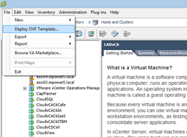 To deploy the vCenter server appliance we follow the standard OVF/OVA deployment process. Select File from the menu and then select Deploy OVF Template… |