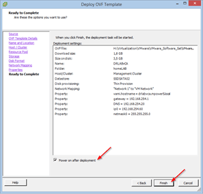 Review the deployment summary. You can select the Radio button to start the Appliance once deployed. Click Next. |