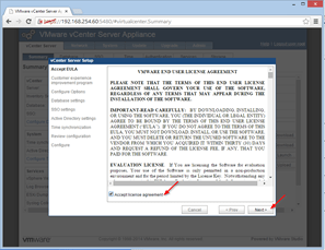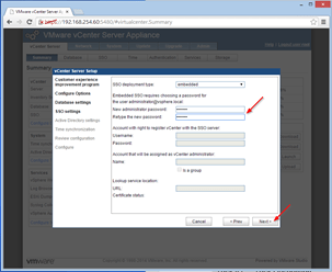 Select the Embedded SSO type. Enter a password fot he SSO Administrator. Password: VMware1! Note: Please take note and recored this password as you will need to use it in future for additional configuration. Click Next. |