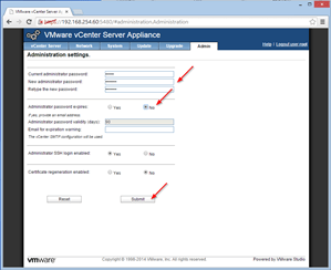 Select the Admin tab. We need to change the Administrator password here. Current Password: vmware New Password: VMware1! Select the No radio button to ensure the Administrator password does not expire. Click Submit. |
