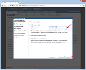 You may need to re-enter the NTP settings here. Select the NTP radio button and complete the NTP address with the correct trusted NTP server IP address. Note: You can use your Domain Controller to serve the time in your envrionment. Click Next. |