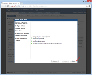 The appliance is configured and the step completed shown. Note: The SSO configuration will take some time. Please DO NOT cancel this process. |