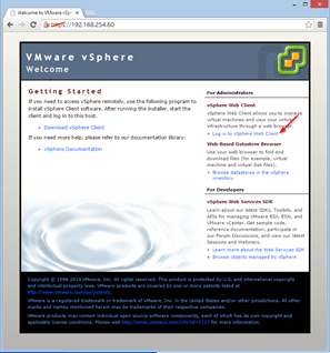 Once the appliance has fully restarted, access the appliance default web page by browsing to: HTTP Address: Https://<fqdn or ip address of appliance> Select the Log on to vSphere Web Client link. |