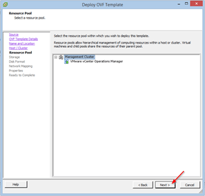 Select the default Resource Pool to which the appliance should be deployed to. Click Next. |